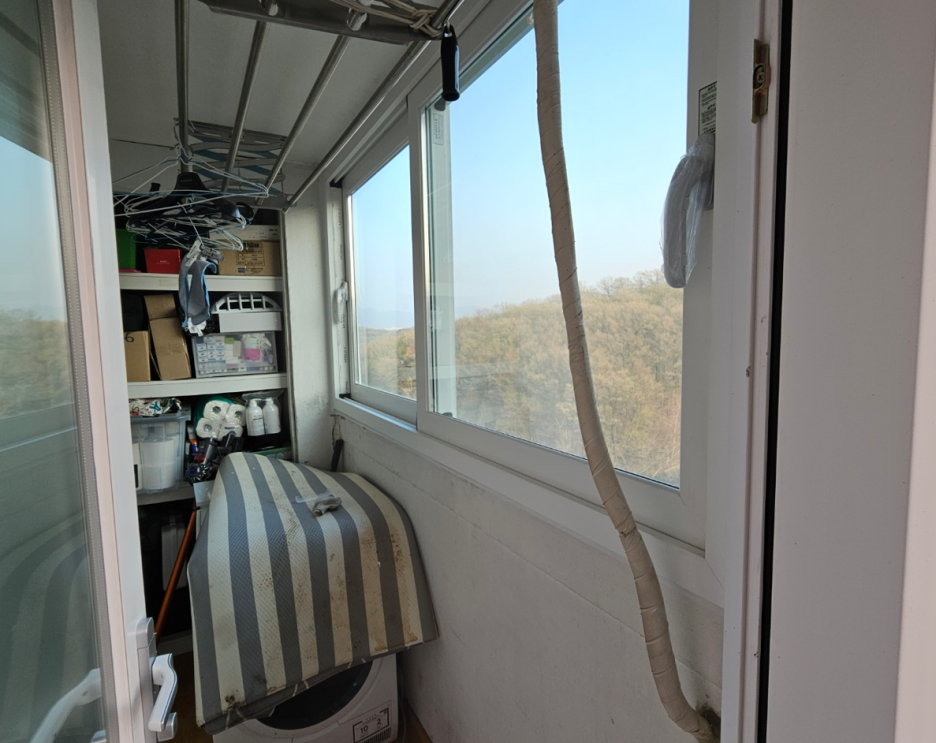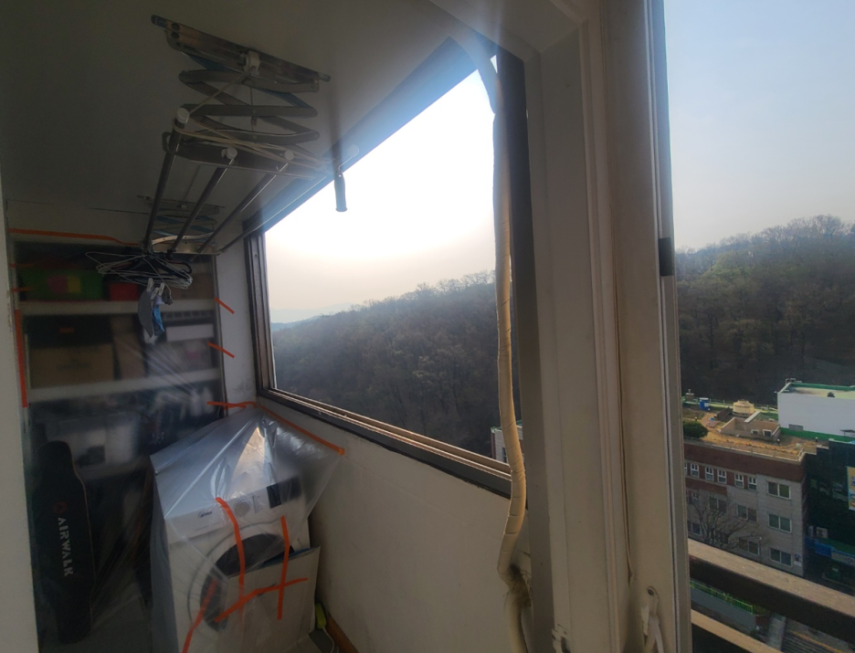 복도식 아파트구요. 거실발코니로 사다리차가 들어가지 못하는 현장이라서 틀은 발코니에서 윈찌로 인상을 했습니다.