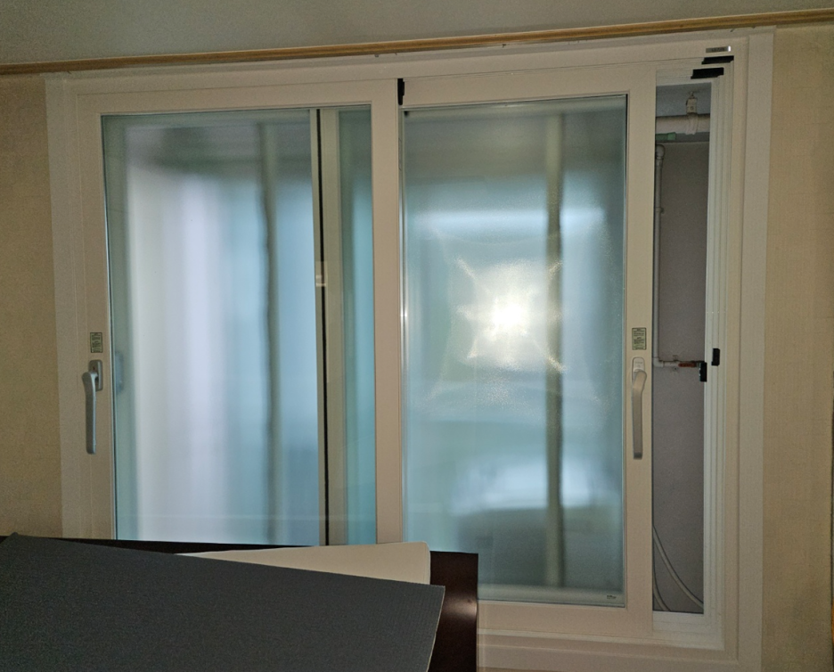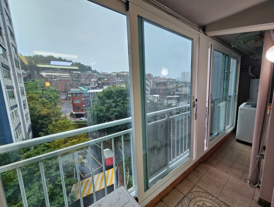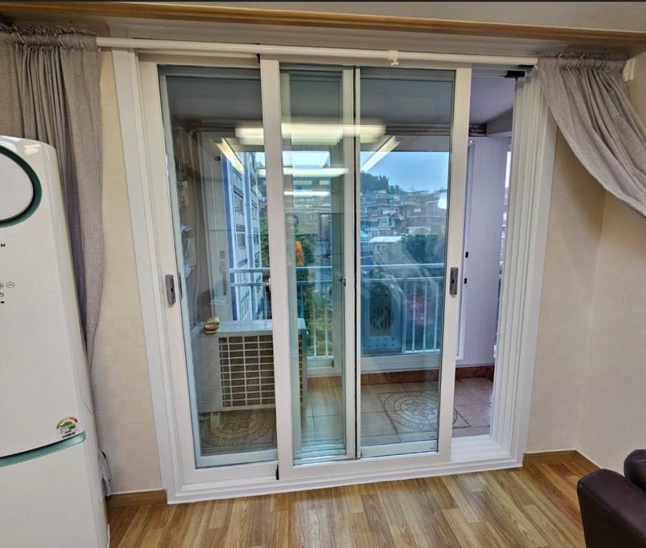거실은 원래 길게 하나의 창으로 되어 있었는데요. 중간에 하리 때문에 샤시가 걸려서 거실 앞 발코니, 안방 앞 발코니 샷시 2개로 나눠서 시공해 드렸습니다.참고로 하리라 하면 사진 오른쪽 천장에 보시면 길게 바깥쪽으로 나온 시멘트 덩어리가 보이실 겁니다.