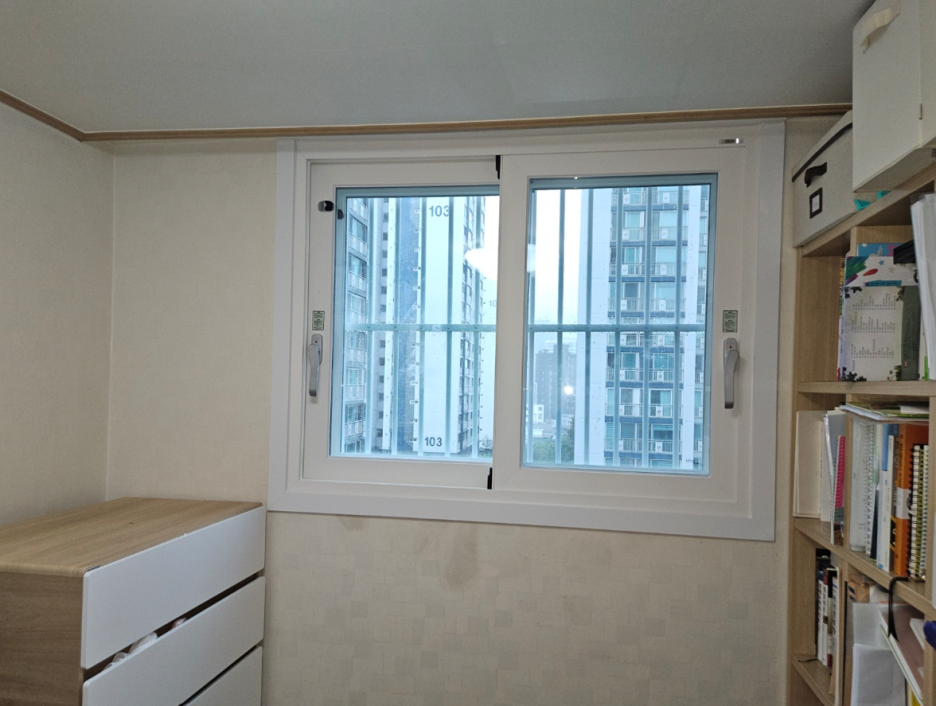네 여기는 작은방 확장 아니 작은 방인데요. 처음부터 이렇게 확장돼서 분양되었다고 하네요. 그래서 외기와 직접 닿고 있어서 발코니 창을 썼습니다. 사실 크기로만 봐도 그냥 일반 이중창을 써도 되는데 고객님께서 그래도 발코니창을 쓰는 게 나을 거 같다고 하셔서 그렇게 해 드렸습니다.^^ 옆에 몰딩도 깔끔하게 잘 마무리가 됐네요.