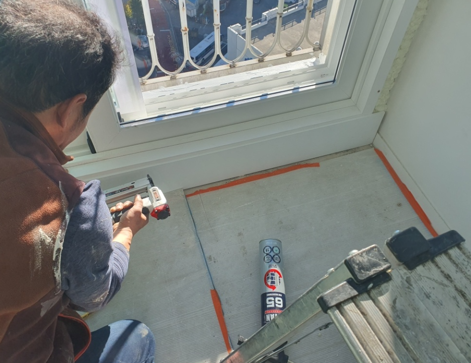 아래 사진은 우측 벽면에 우레탄 폼 사춤 사진 인데요. 틀을 벽에 딱 붙게 시공을 하면 벽에 냉기가 샤시에 그대로 전해져서 단열이 안 됩니다. 그래서 저 정도 공간을 띄우고 거기에 우레탄 폼 충진을 합니다.