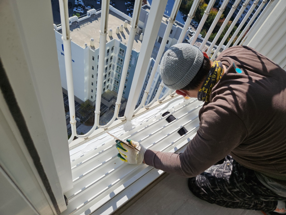 또한 발코니 하부 칼라판 앞쪽에도 혹시 모르니 실리콘을 넓게 펴서 발라 줍니다.