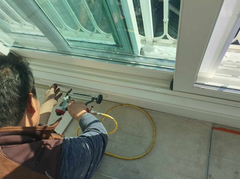 네. 여기 고객님은 이사 하실때 거실 확장하시면서 덧방을 하고 오셨는데 그 당시 유리 안에 있는 유리 무늬살들이 다 무너져 내려서 보기도 싫고 너무 추워서 교체를 결정 하셨습니다.