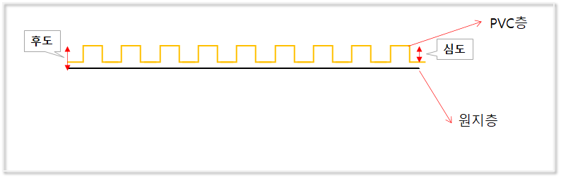 보시는 바와 같이 종이위에 PVC를 도포하게 되는 데요. 전체적인 두께를 후도, 거기서 얼마나 안쪽으로 들어갔냐가 심도라고 합니다. 즉 후도가 두꺼우면 PVC 도포량이 많은 거구요. 그럴 수폭 더 다양한, 즉 올록볼록한 디자인을 많이 구현할 수 있겠죠? 그럼 더 이쁘겠죠? 그럼 더 비싸겠죠?ㅎㅎㅎ 그렇습니다. PVC 도포량이 많을 수록 더 다양한 디자인을 낼 수있고 PVC는 기름에서 뽑아내니까 더 비싸지는 겁니다. 대표적인게 LG 디아망 입니다.