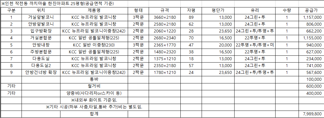 그럼 이제 이 아파트의 창호 견적을 보겠습니다.