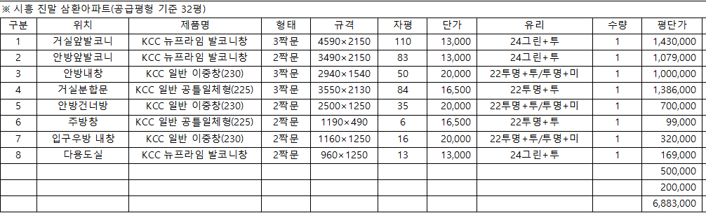 25평형대의 새시 가격보다는 32평형의 가격이 싸게 나오네요..ㅎㅎㅎ