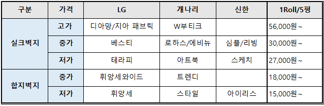 우리나라 벽지는 LG 벽지, 개나리 벽지, 신한 벽지 이 3곳이 거의 70%를 차지한다고 보시면 됩니다.