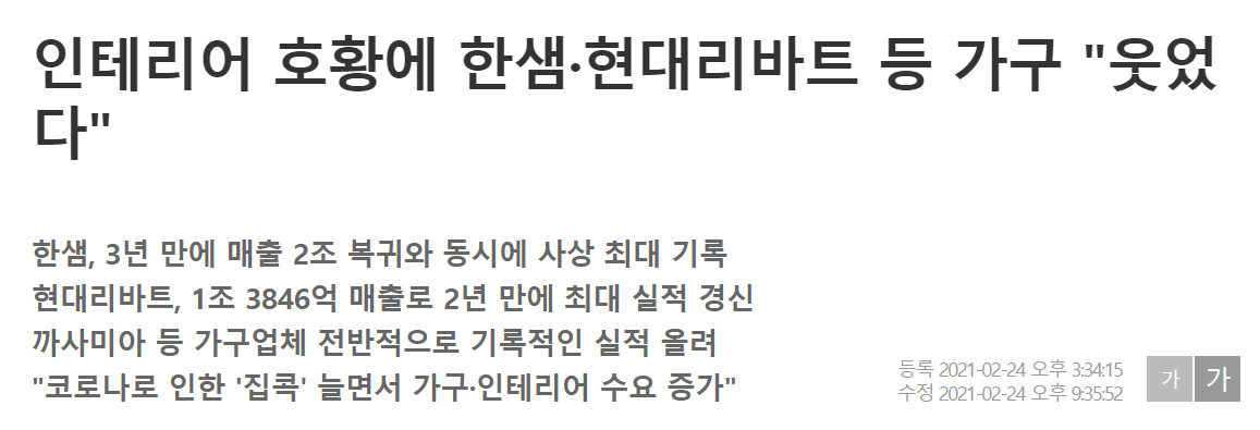20대와 30,40대들이 영끌을 하면서 집을 사고, 재택근무로 인하여 그동안 안 보이던 집안의 불편한 것들이 눈에 띄어서 많은 사람들이 인테리어 소품 및 전자제품, 인테리어를 새로 했습니다.