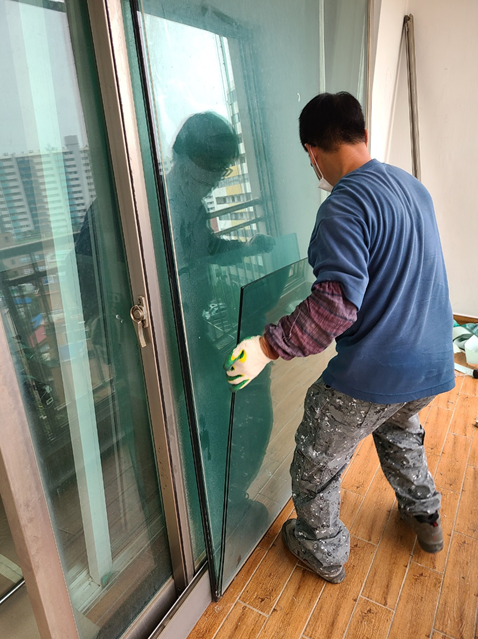 그런 다음 창짝을 틀에서 분리합니다. 그리고 여기에서 반대편 유리의 실리콘도 긁어서 제거를 합니다.