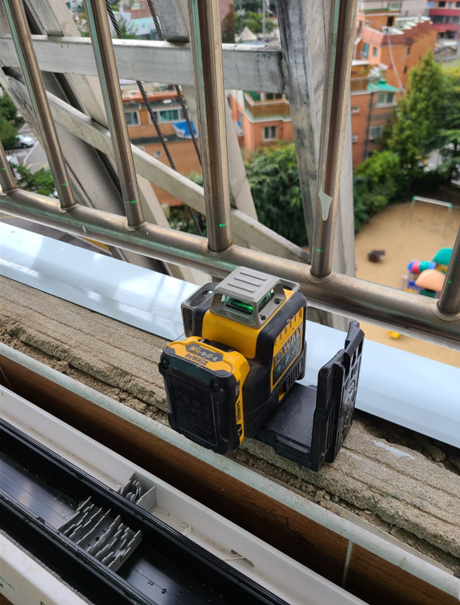 아래 보시는 거처럼 우선 레이저 수평기를 띄워 놓고 양쪽 벽으로 쏴지는 레이저를 보고 대충 바닥의 수평을 봅니다.