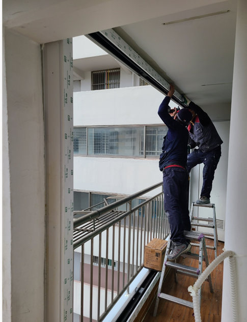 오른쪽 사진이 벽에 앙카로 고정하는 모습입니다. 저런 창을 하프(half)창 이라고 하는데 이런 창들이 발코니창(풀(full)창)보다는 아무래도 시공이 좀 용이합니다.