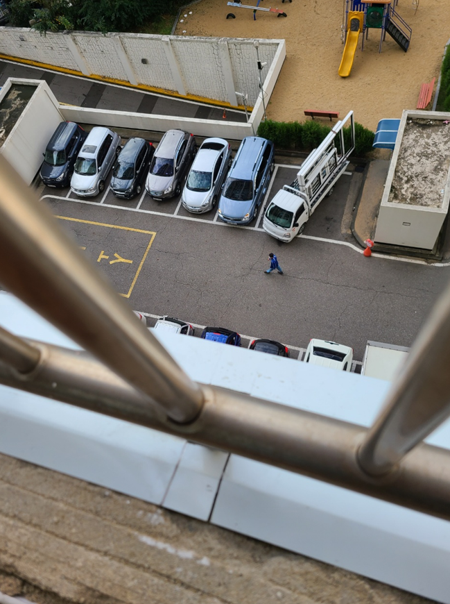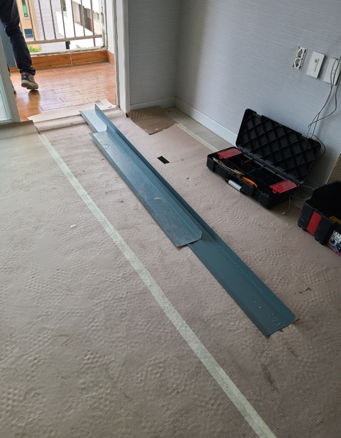 그리고 현장에서는 하부 갈바 작업을 준비 중이셨습니다. 하부 갈바 작업이라고 하는 건 발코니 하부에 물이 들어올 것을 방지하기 위하여 하부 턱에 철로 된 바를 접어서 턱 위에 놓아서 외부로 물이 흘러내려가게 하는 것을 말합니다.