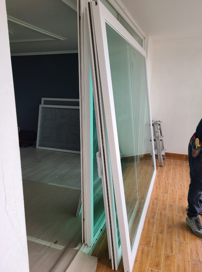 현장에 도착했을 때는 우선 창호(샤시) 틀만 도착해 있더라고요. 왜냐하면 창호는 공장에서 창틀과 창짝을 다 제작해서 유리는 다시 유리 대리점으로 보내 집니다. 그럼 거기서 유리를 끼워서 현장으로 납품하는 게 거의 대부분입니다. 간혹 유리 공장이나 대리점에서 받아서 같이 오는 경우도 있지만요.