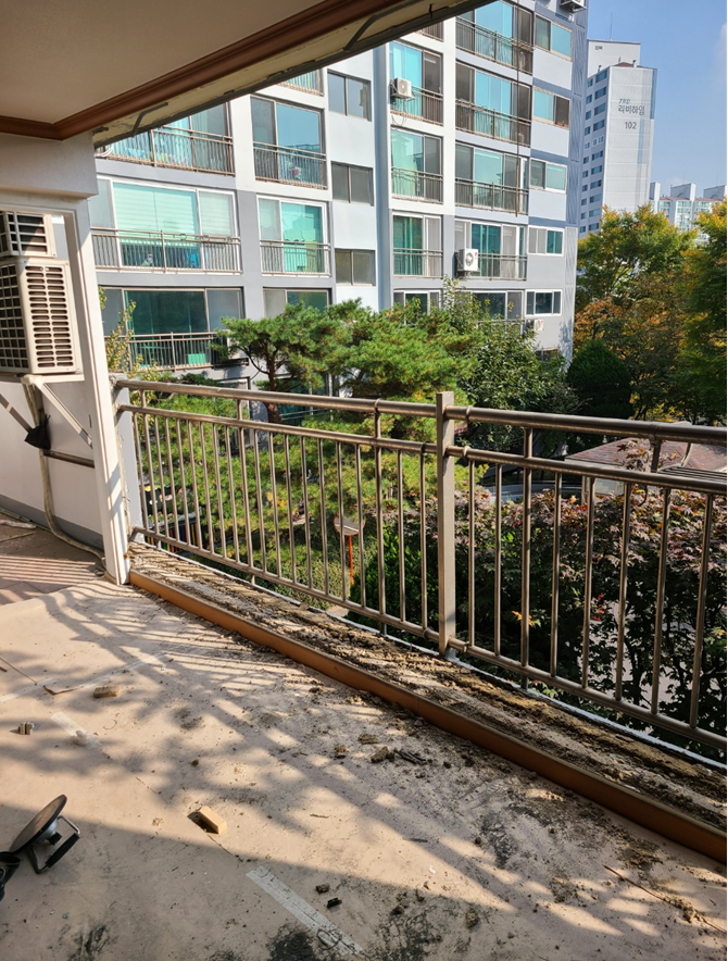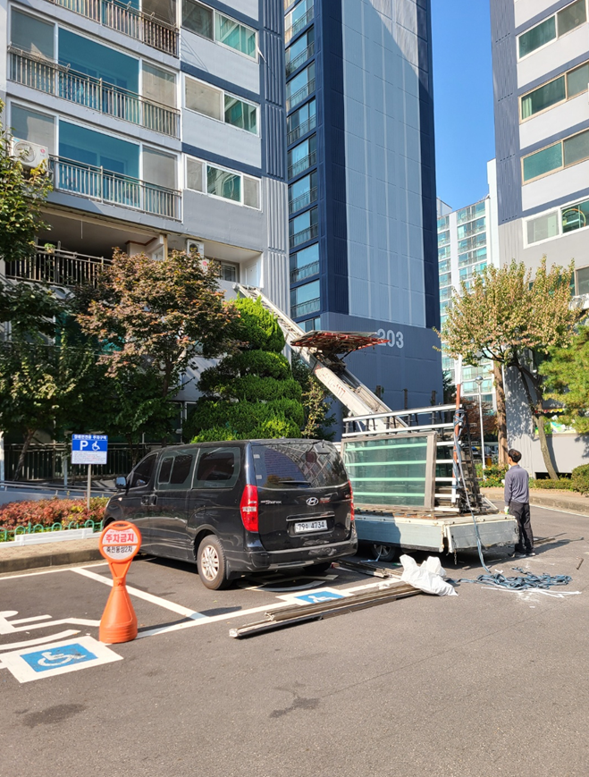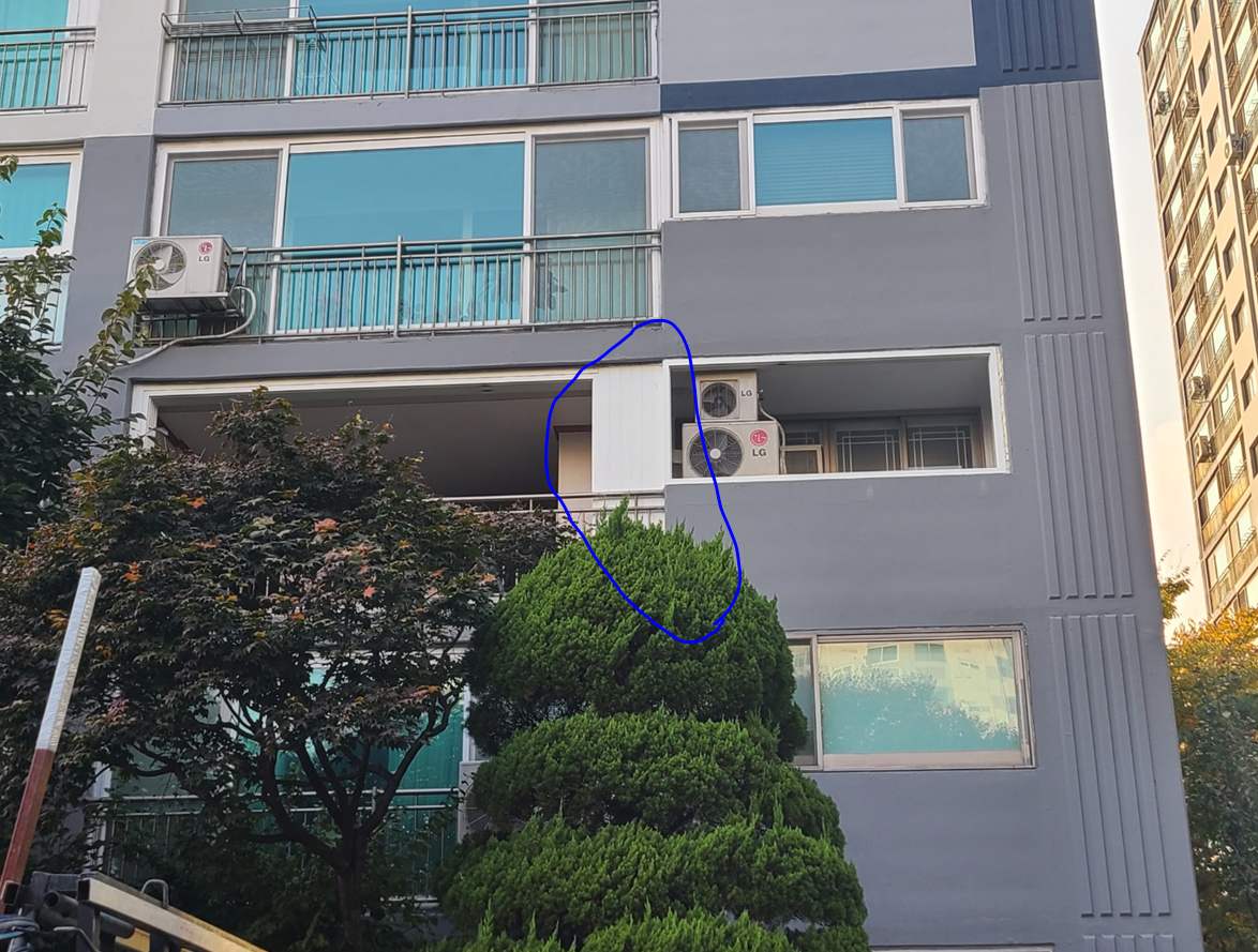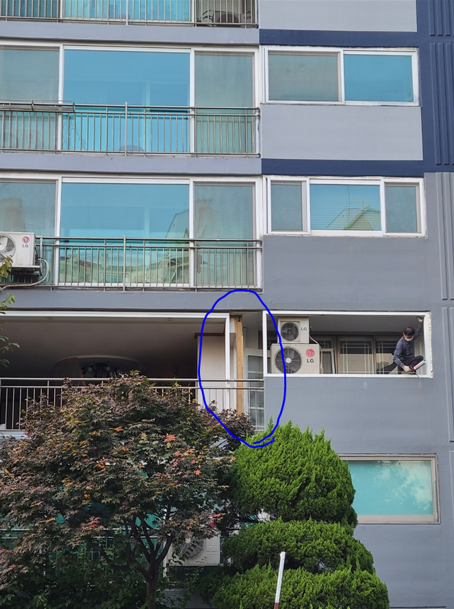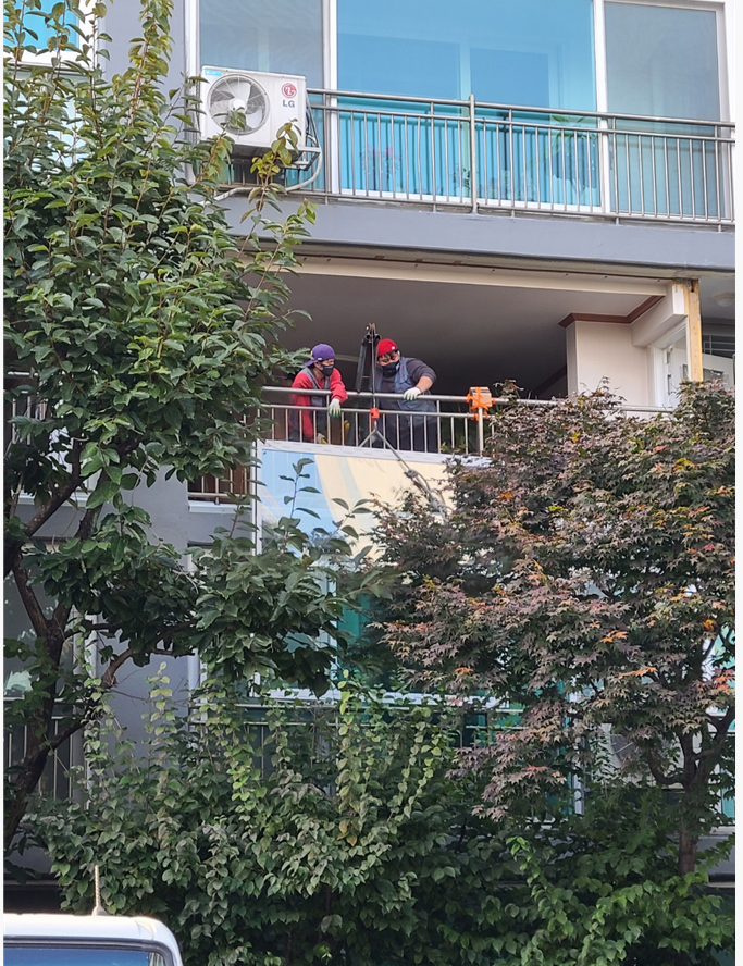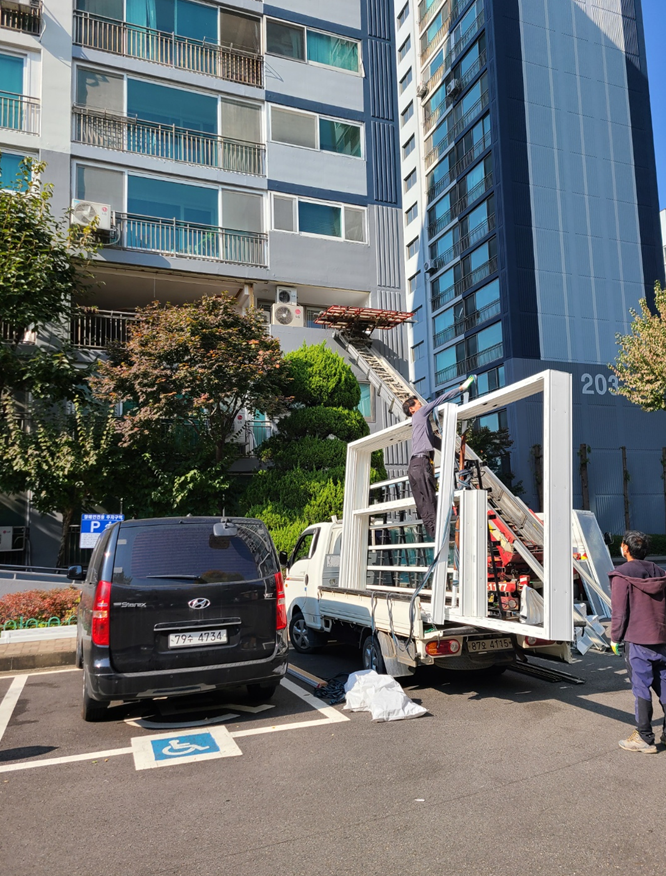 여기는 저층인 데다가 앞에 나무로 인해서 사다리차로 철거 자재와 틀만 올렸습니다.