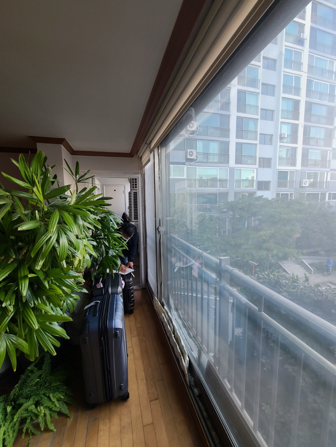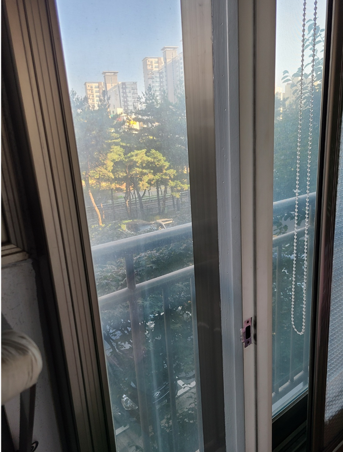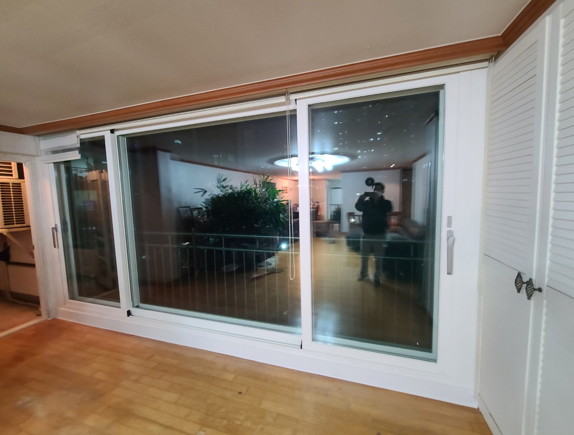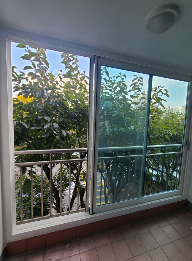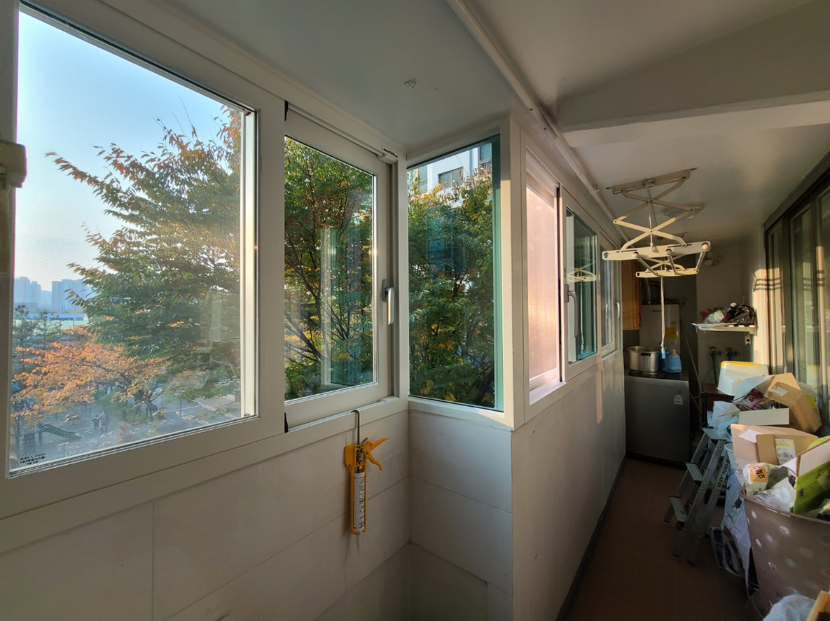 우선 위에 맨 오른쪽 사진처럼 여긴 최초에 발코니창에 창을 덧대서 확장을 한 집이었습니다. 그런데 확장을 하면서 발코니 쪽 문을 설치하는데 거실 쪽으로 당겨 달아서 외부의 창이 더 크고 내부의 창이 더 작은 형태였습니다.