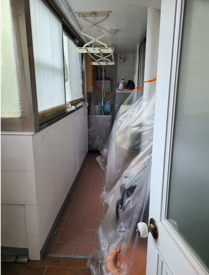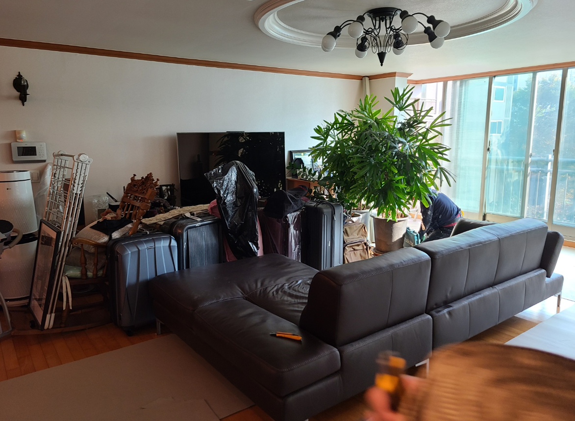 보시는 거처럼 거실과 발코니의 짐들을 싹 다 모아서 거실 한가운데로 정리를 했습니다.