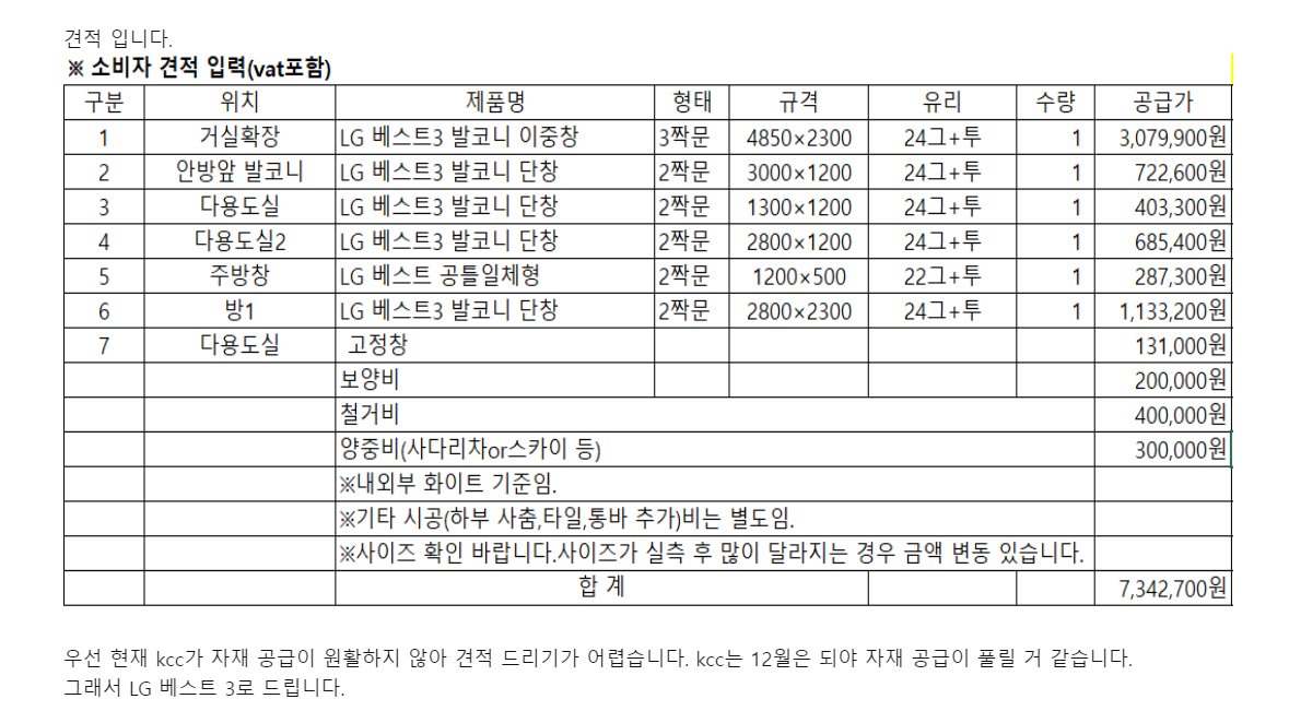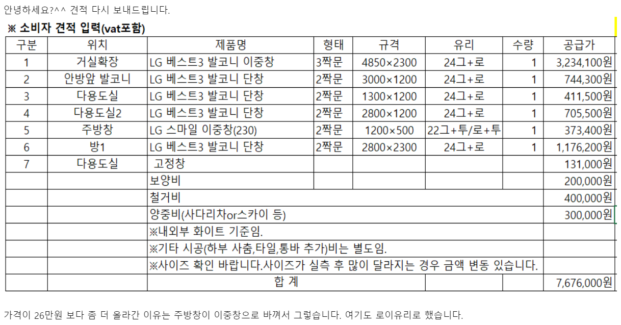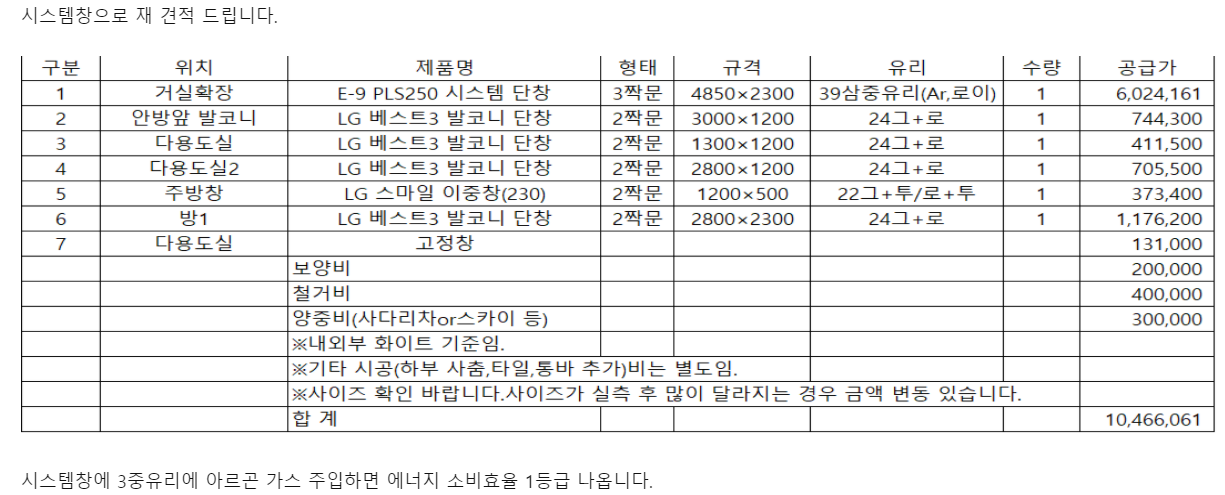 이 현장은 견적을 많이 드렸었는데요. 처음엔 일반 창으로 하신다고 하셨다가 그다음엔 거실 창만 시스템창으로, 그다음엔 주방창을 이중창으로, 최종 실측 후에는 주방창을 다시 단창으로 견적이 진행되었던 현장입니다.