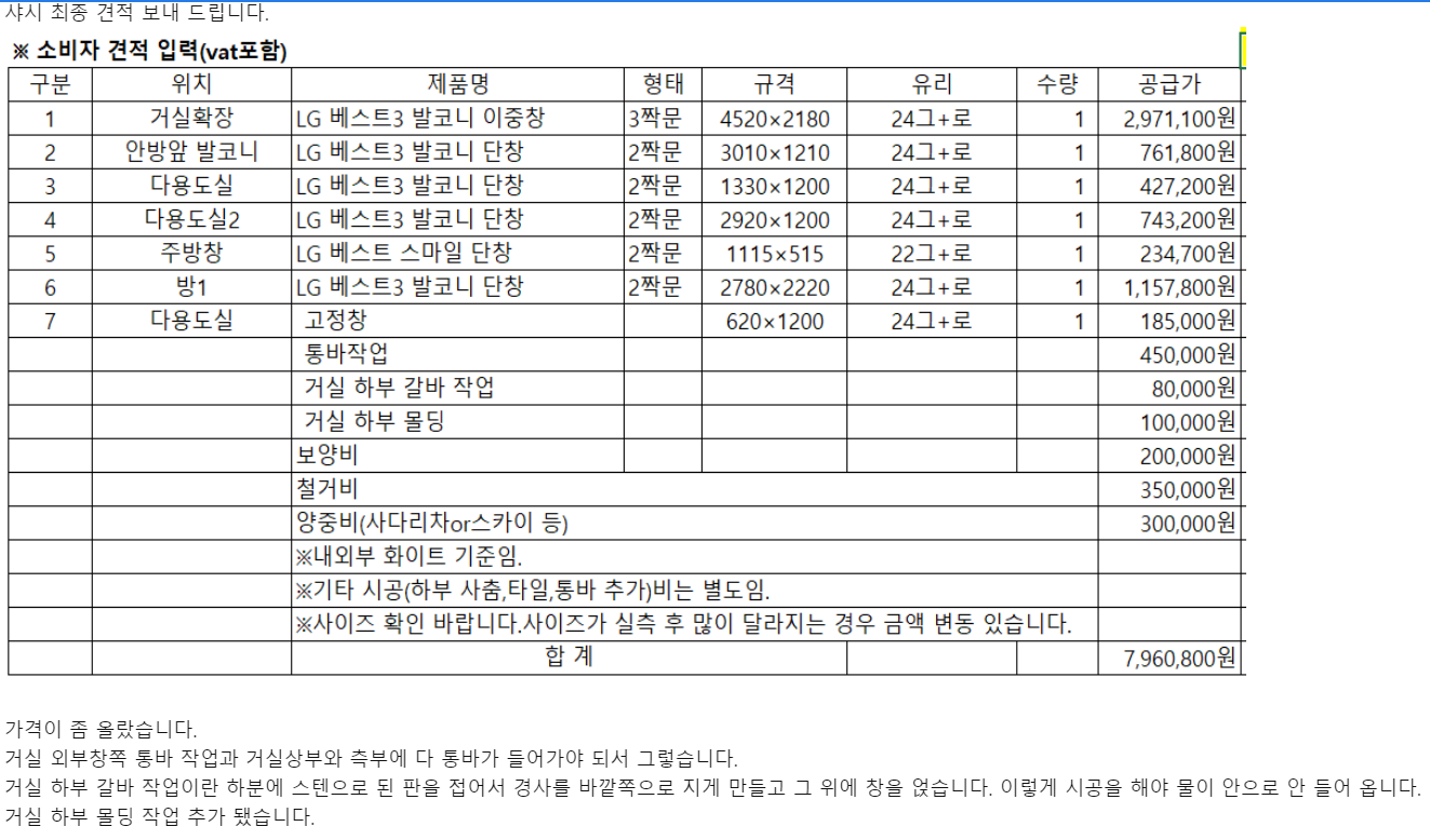 최초 견적 734만 원에 796만 원으로 올랐는데요.... 그런데 보시면 통바 작업 45만 원, 하부 갈바 작업 8만원, 하부 몰딩 10만 원 해서 총 63만 원이 추가가 됐습니다. 그런데 이 해당 작업은 현장에 가보지 않으면 모르는 것들이라서요. 특히 이번에 통바 작업이 비용이 많이 나왔습니다. 이건 원래 해당 부위가 현재는 창으로 되어 있었습니다. 만약 입주하면서 했더라면 고정창으로 들어가는 자리여서 자재 값이 좀 많이 나왔습니다. 그러니까 고정창 대신 통바가 들어가게 된 겁니다.