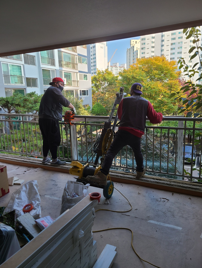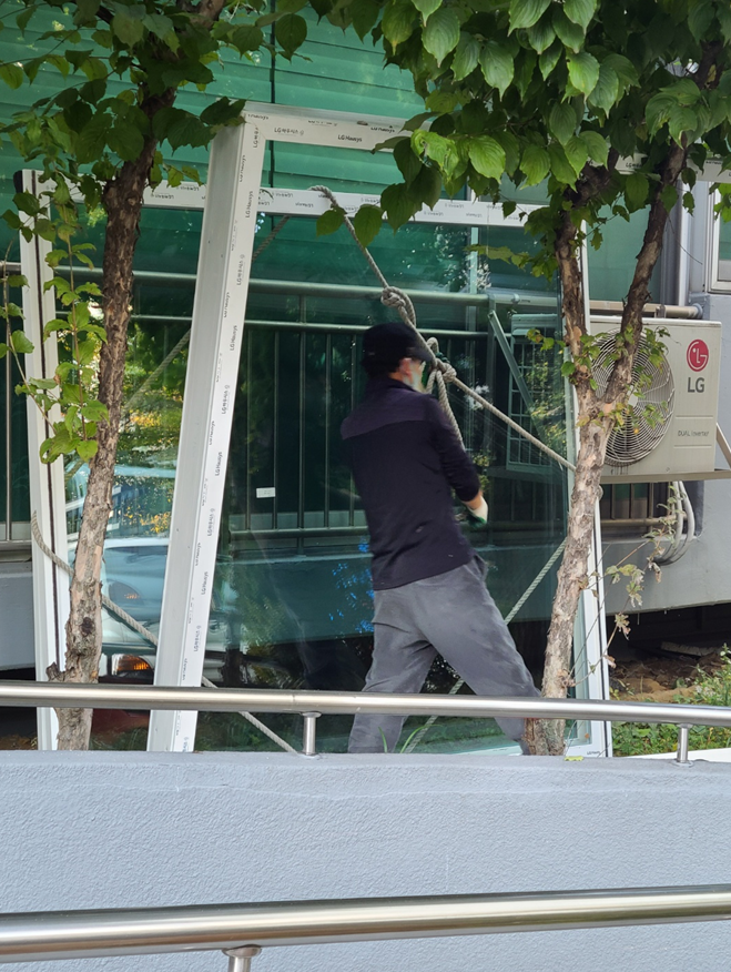 원래는 통상 사다리차로 철거 자재와 새로 시공할 창틀과 창짝을 다 올리는데요.