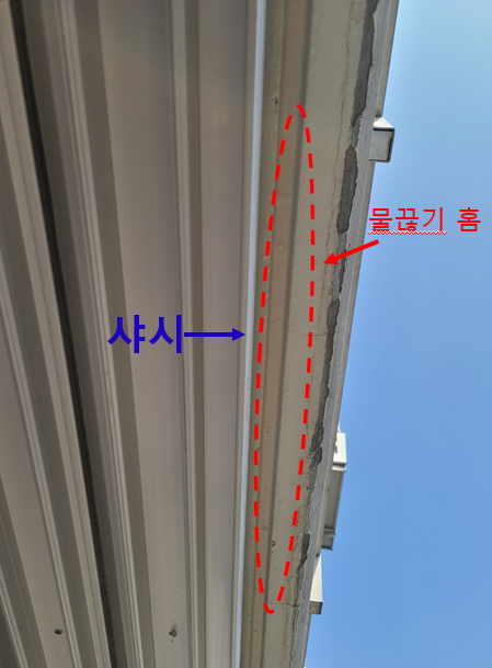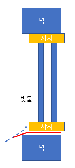 이렇게 되면 물이 외부에서 벽을 타고 내려오다가 저 홈을 만나면 위로 타고 올라갈 듯하다가 중력 때문에 자연스럽게 떨어지죠....ㅎㅎ 그렇지 않으면 그냥 벽을 타고 흐르다가 실리콘이 터져 있으면 거기로 들어오죠...