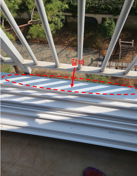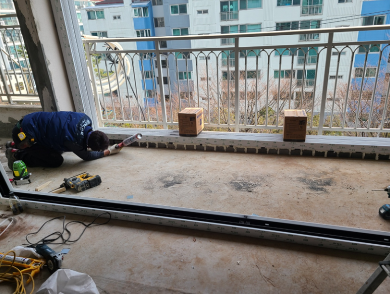 그럼 틀을 설치합니다. 발코니 창을 설치할 때는 위쪽에 물끊기 홈이라고 있습니다. 이 안쪽으로 샤시를 설치해야 외부에서 실리콘이 설사 터진다 하더라도 누수가 방지가 될 수 있습니다.