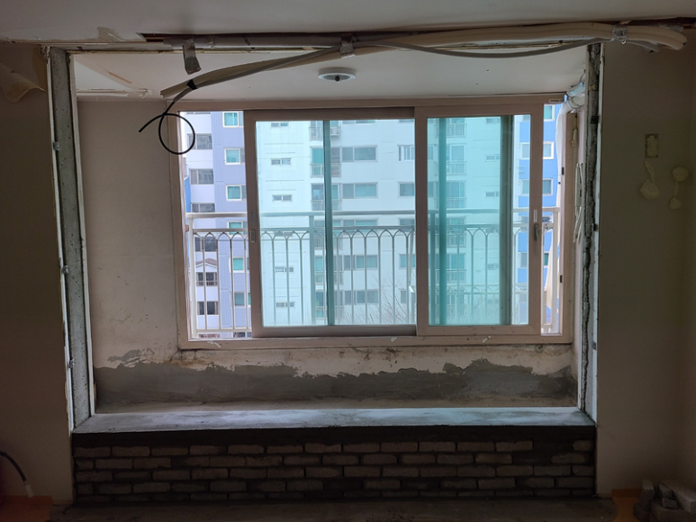 이중창을 하시게 되면 하부에 조적을 쌓고 저렇게 폼을 채워 넣어서 단열을 조금이라도 더 될 수 있게 해 드립니다.