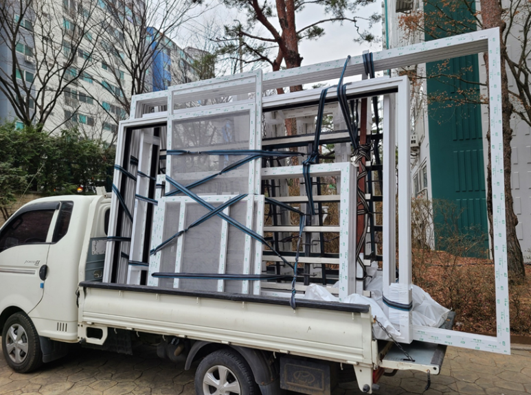 보시는 거 처럼 저렇게 창짝을 사다리차에 올려서 하나씩 다 가지고 들어 옵니다.