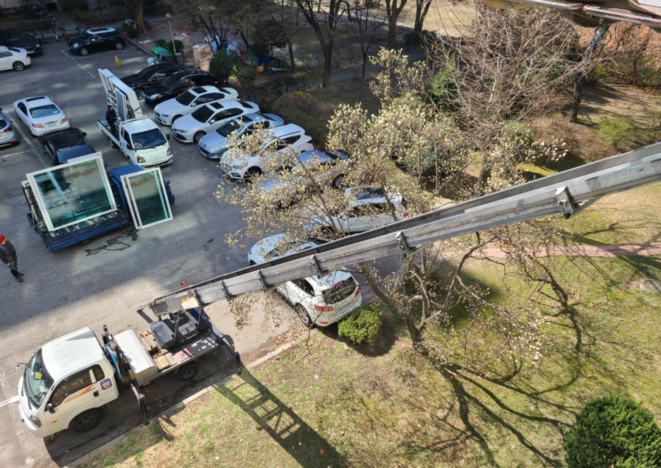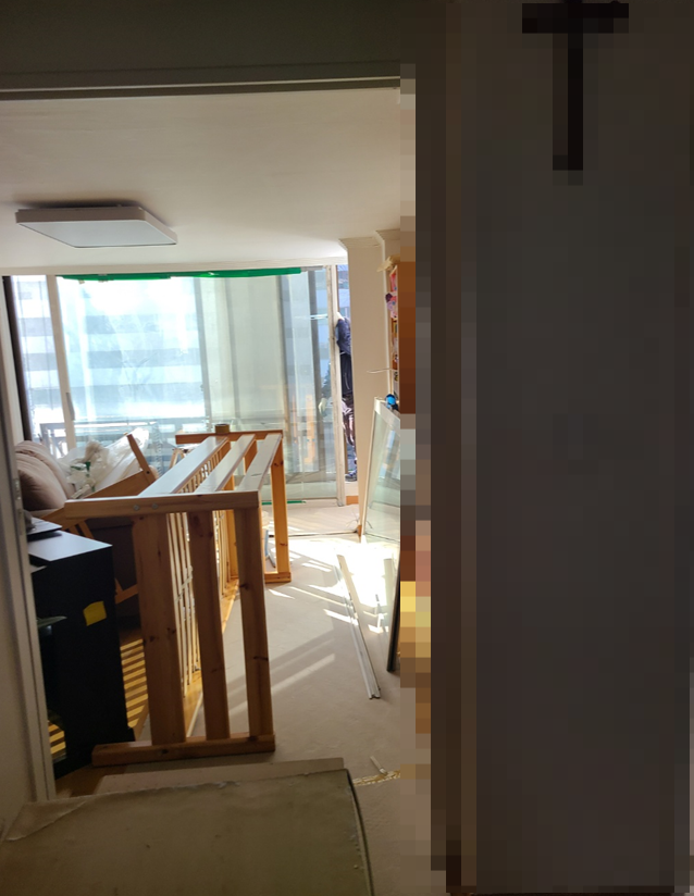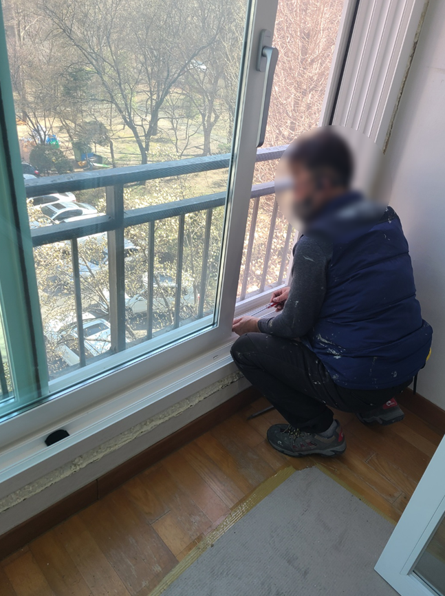 우선 바닥 보양부터 진행했습니다. 오늘 교체할 곳은 거실 확장 부위와 안방 앞 발코니, 작은방 내창 이렇게 3곳이 교체 예정입니다. 우선 짐들은 고객님께서 사전에 치울 수 있는 것들은 다 치워 주셔야 됩니다. 그래야 일이 빨리 진행이 되죠... 그리고 시공자분들은 무거운 짐들은 옮기시는데 가벼운 짐들과 중요한 짐들까지 옮겨 달라 하면 좀... 그러합니다. 나중에 뭐가 있느니 없느니 흠집이 생겼느니 ㅎㅎㅎ 그래서 가급적 사전에 미리 치워 주시는 게 좋습니다.