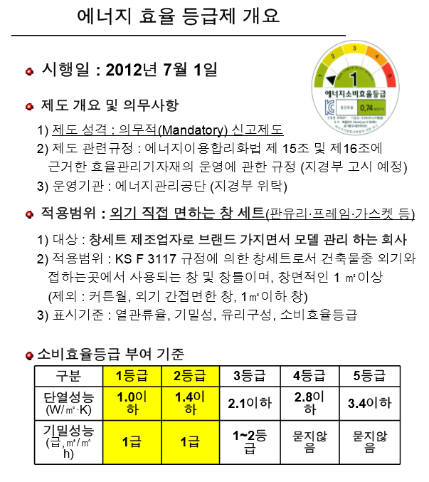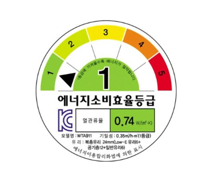 즉 창호에도 에너지 소비효율 등급이 있습니다. 바로 아래와 같은 스티커에 창호 에너지 소비 효율 등급을 표시하게 되어 있습니다.